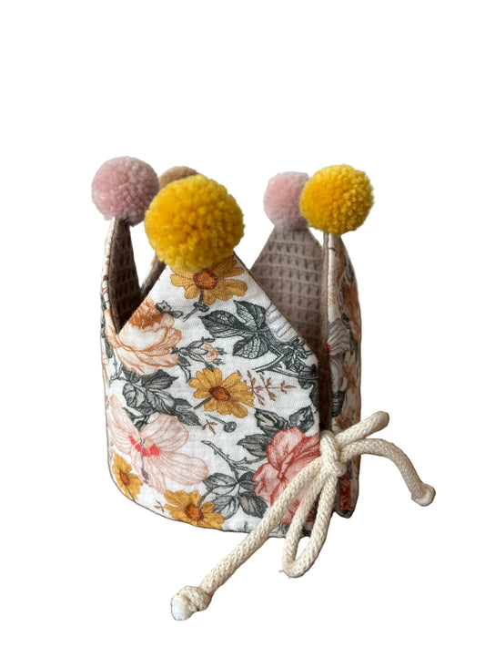 Stoffkrone zum Binden "Kinder-Geburtstag & Co" (Smokey Beige/Flowers) mit Pompons