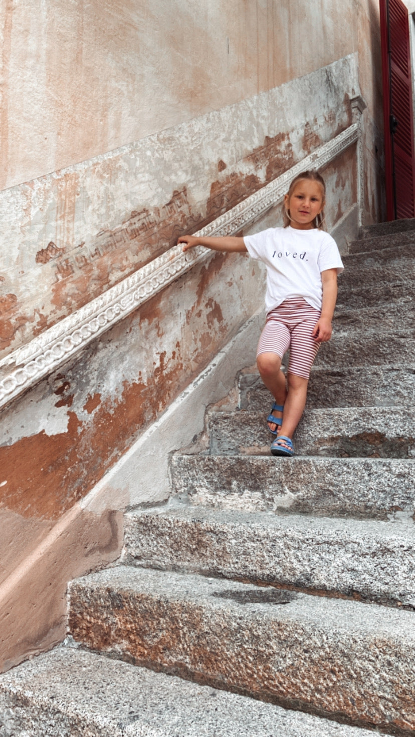 Süße Tobeleggings für den Sommer. Passt zu allem und macht mit den unkomplizierten Streifen in Kupfer ganz viele Abenteuer mit. Auf gehts! Handgemacht im Allgäu - von hej lille.