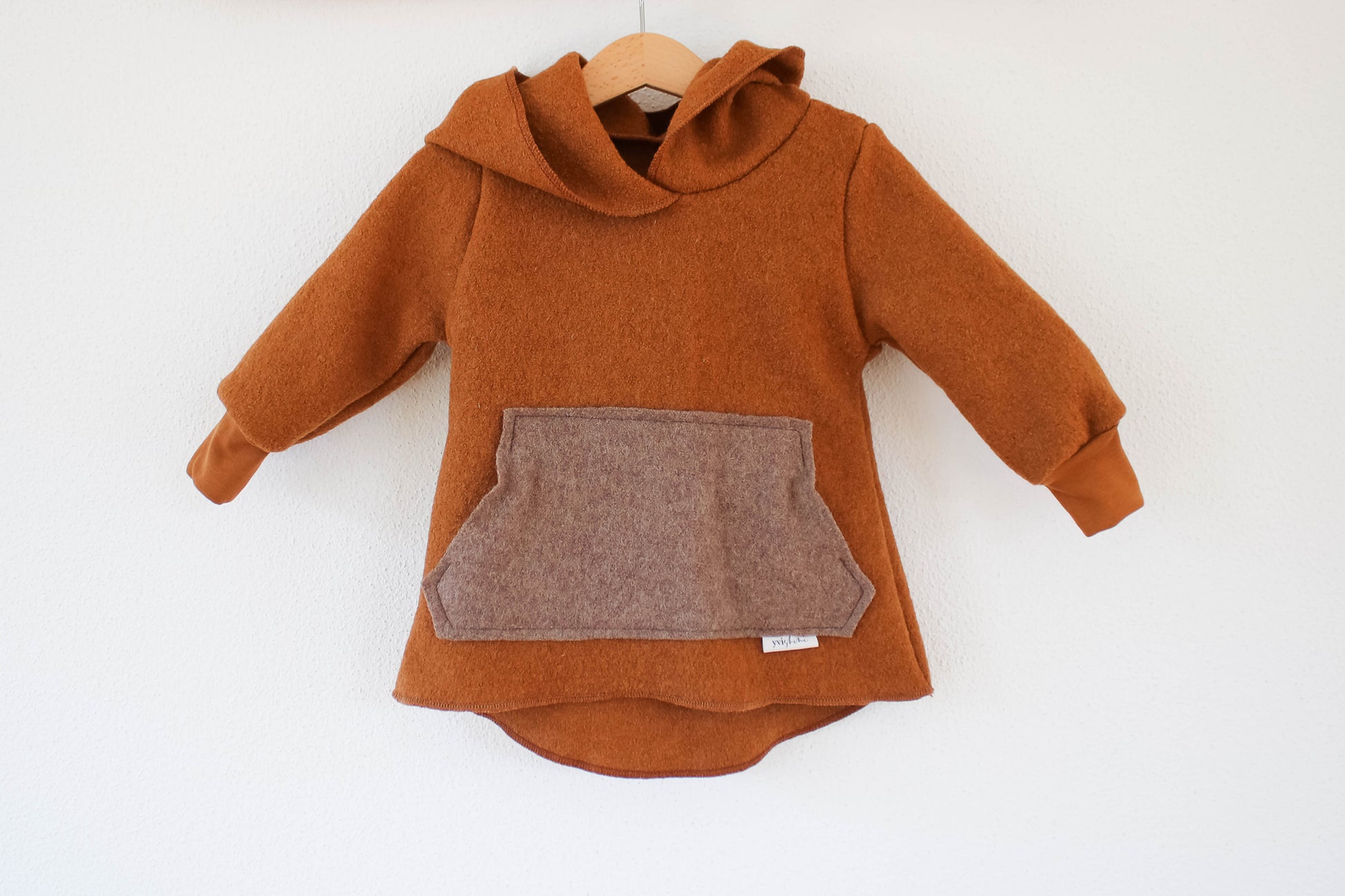 Hej - diesen Herbst wird es cool. Der lässige Throw von Yvonne und ihrem Label Yvishine peppt die Kindergarderobe auf. Der Überwurf aus 100 % Schurwolle ist ein praktischer Begleiter im Kinderalltag. Zu warm, zu kalt? Nicht mit dem schönen Throw in Zimtbraun. Dabei sieht der Pullover mit seiner Zwergenkapuze und der aufgesetzten Bauchtasche echt lässig aus.